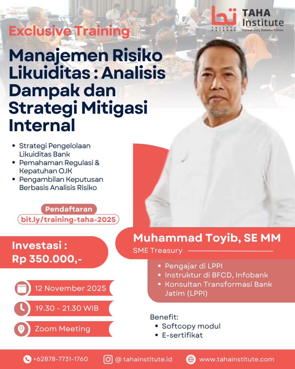 Ikuti Exclusive Training “Manajemen Risiko Likuiditas : Analisis Dampak dan Strategi Mitigasi Internal” bersama Muhammad Toyib, SE MM, pengajar LPPI sekaligus konsultan transformasi perbankan.